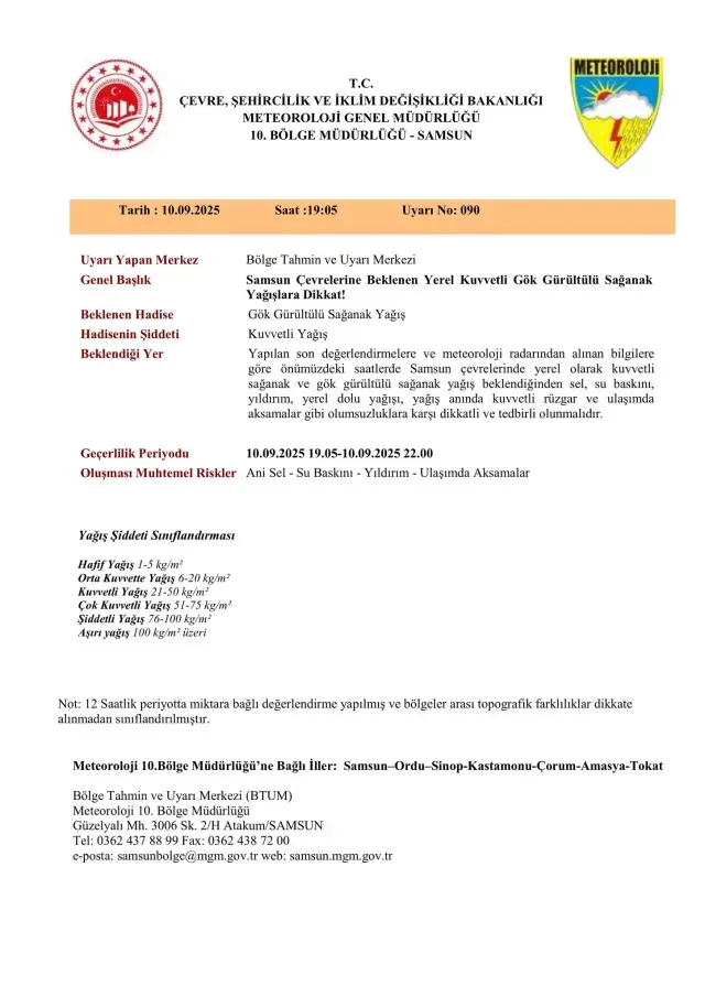 Meteoroloji 10. Bölge Müdürlüğü’nün iddiaları doğrultusunda Samsun Valiliği vatandaşlara resmi ihtar yaptı. Açıklamada 10 Eylül 2025 saat 19.05 ile 22.00 ortasında gök gürültülü ve kuvvetli sağanak beklendiği bildirildi. Vatandaşların ani sel, su baskını, yıldırım, dolu ve kuvvetli rüzgâra karşı dikkatli olması gerektiği vurgulandı.